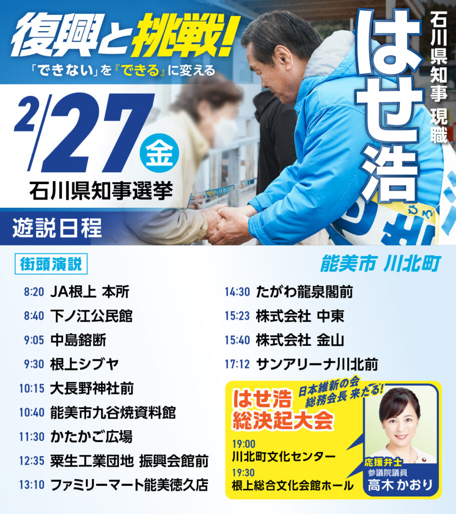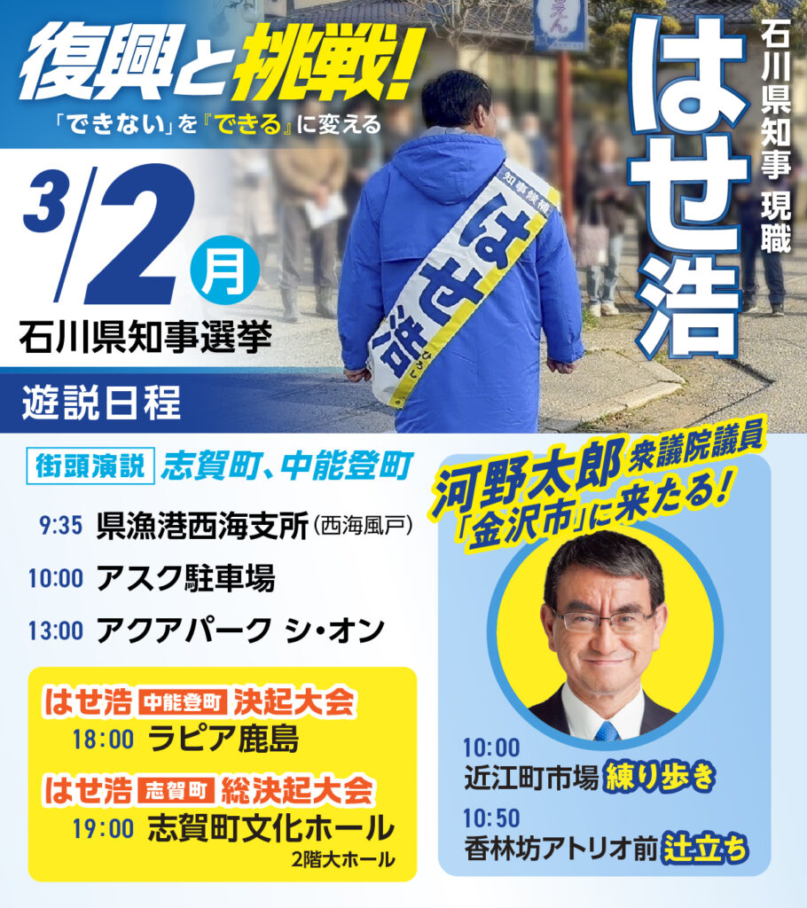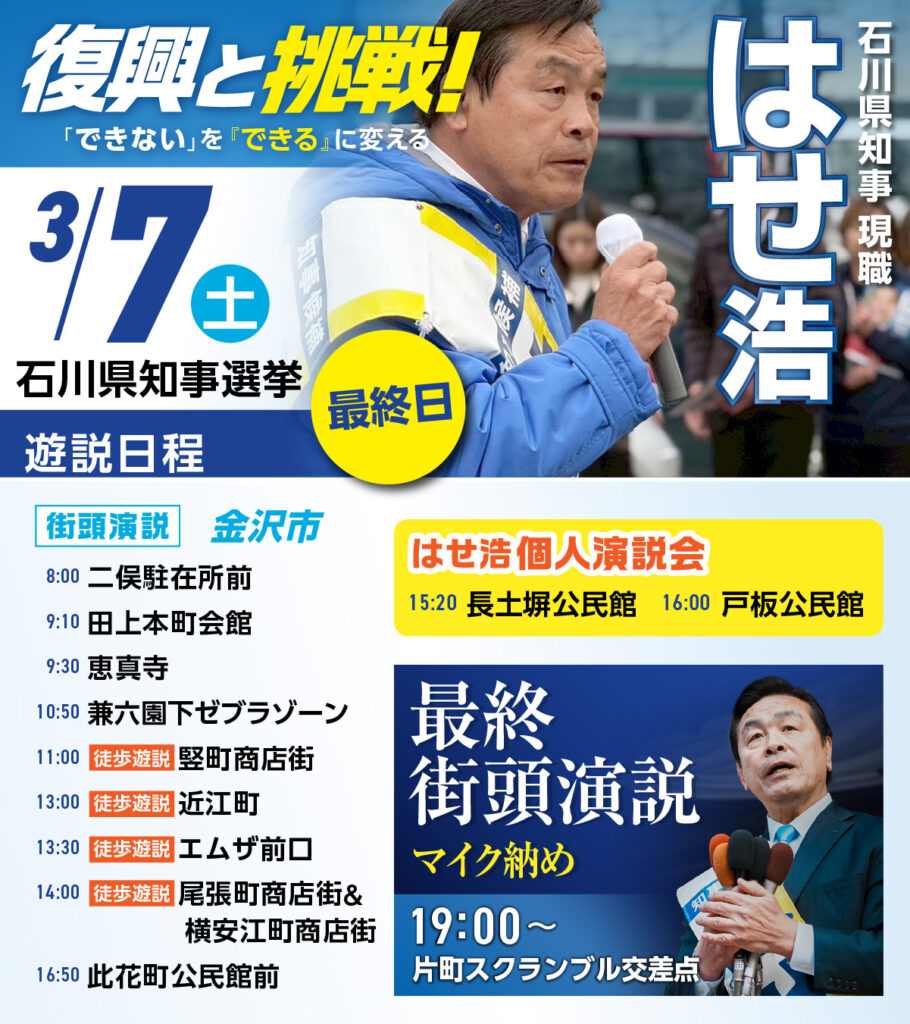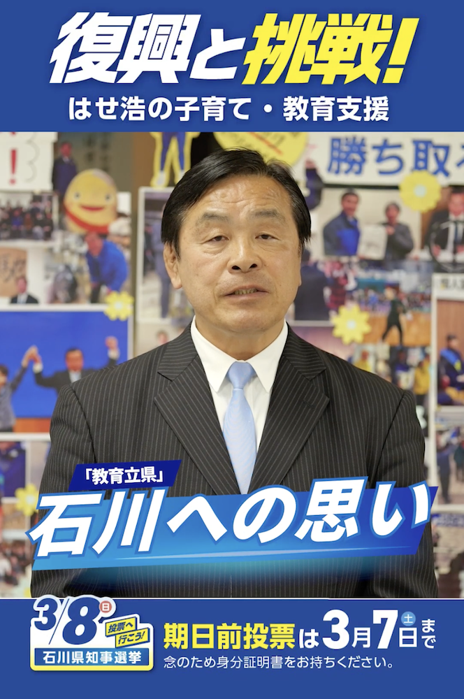 この4年間、能登半島地震や奥能登豪雨で被害を受けたインフラの復旧や、失われた家や仕事を取り戻すために、被災者お一人お一人に寄り添い、国とのパイプを最大限に生かして復旧を進めてきました。また、「石川の成長戦略」を策定し、県全体の成長にも力を注いできました。