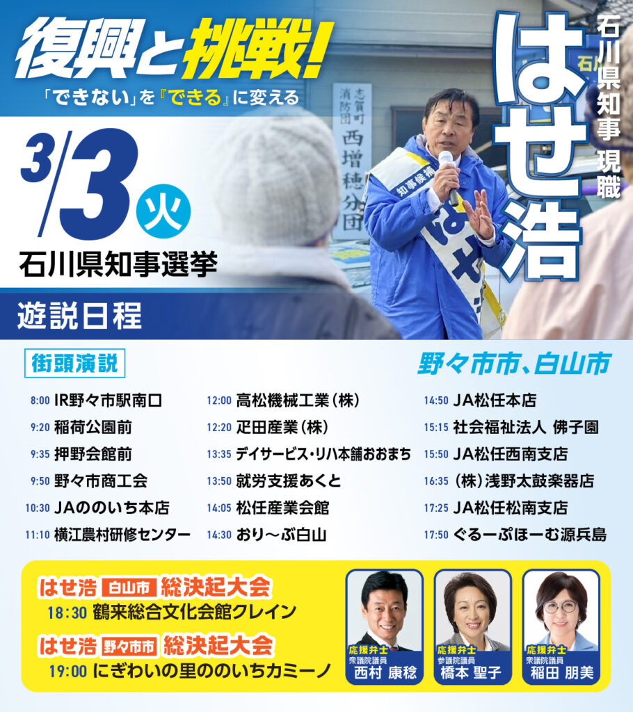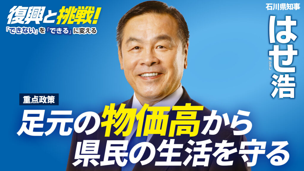 これからの4年間は「復興と挑戦」。能登の創造的復興を必ず進めます。ものづくり産業や農林水産業、観光産業など、石川の成長エンジンをさらに強くし、防災、介護、福祉、医療など、県民の暮らしの安全・安心を守ります。