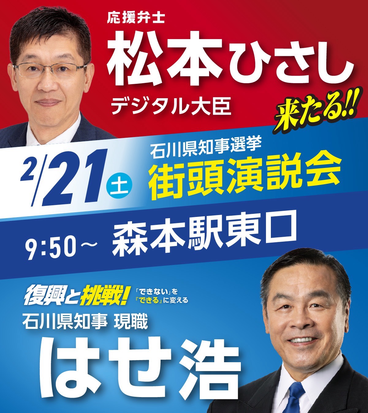 また、9:50〜森本駅東口にて、松本尚デジタル大臣が応援に駆けつけてくださいます。