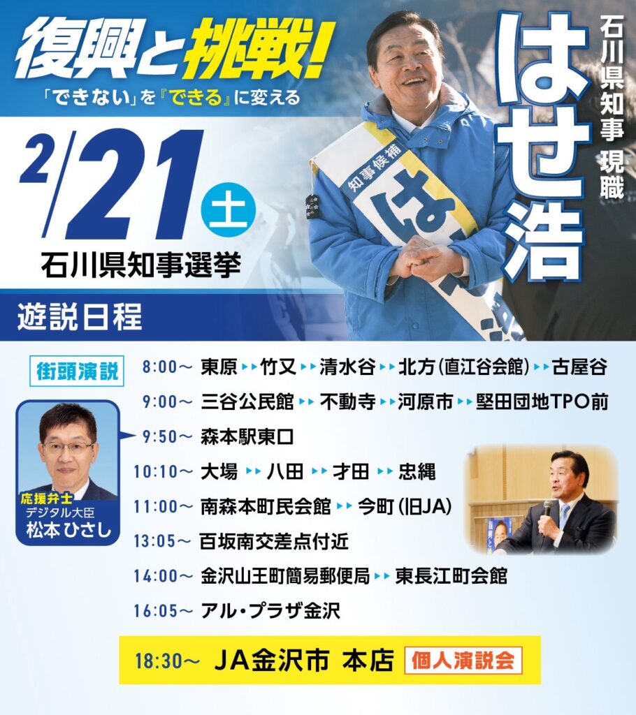 【2/21 遊説予定】金沢市の城北エリアへ参ります!はせ浩 石川県知事選挙