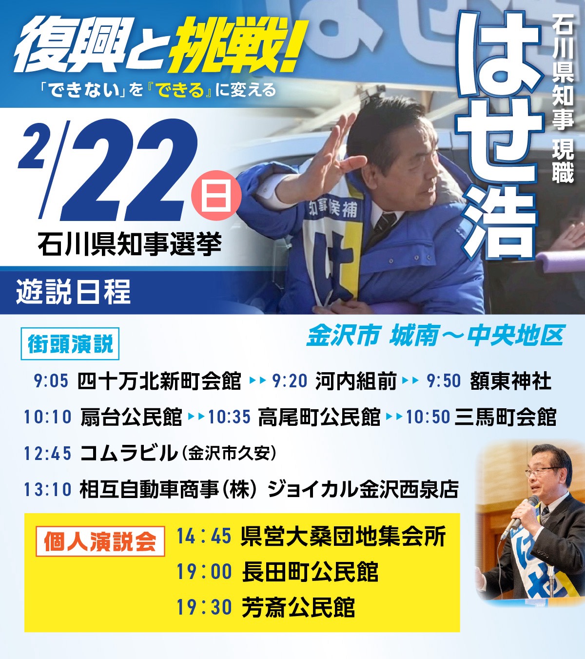【2/22 遊説予定】金沢市の城南〜中央地区へ参ります!はせ浩 石川県知事選挙