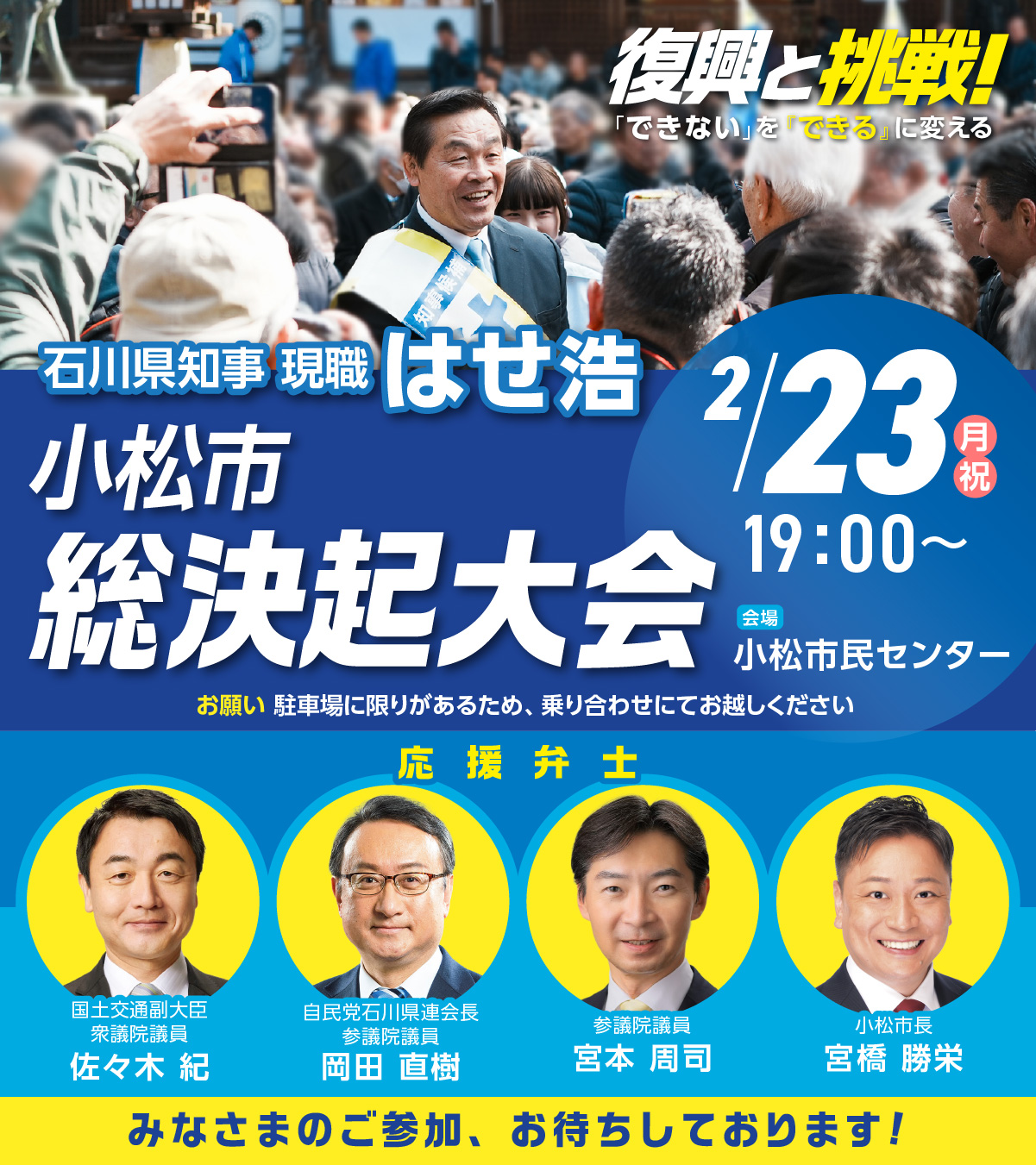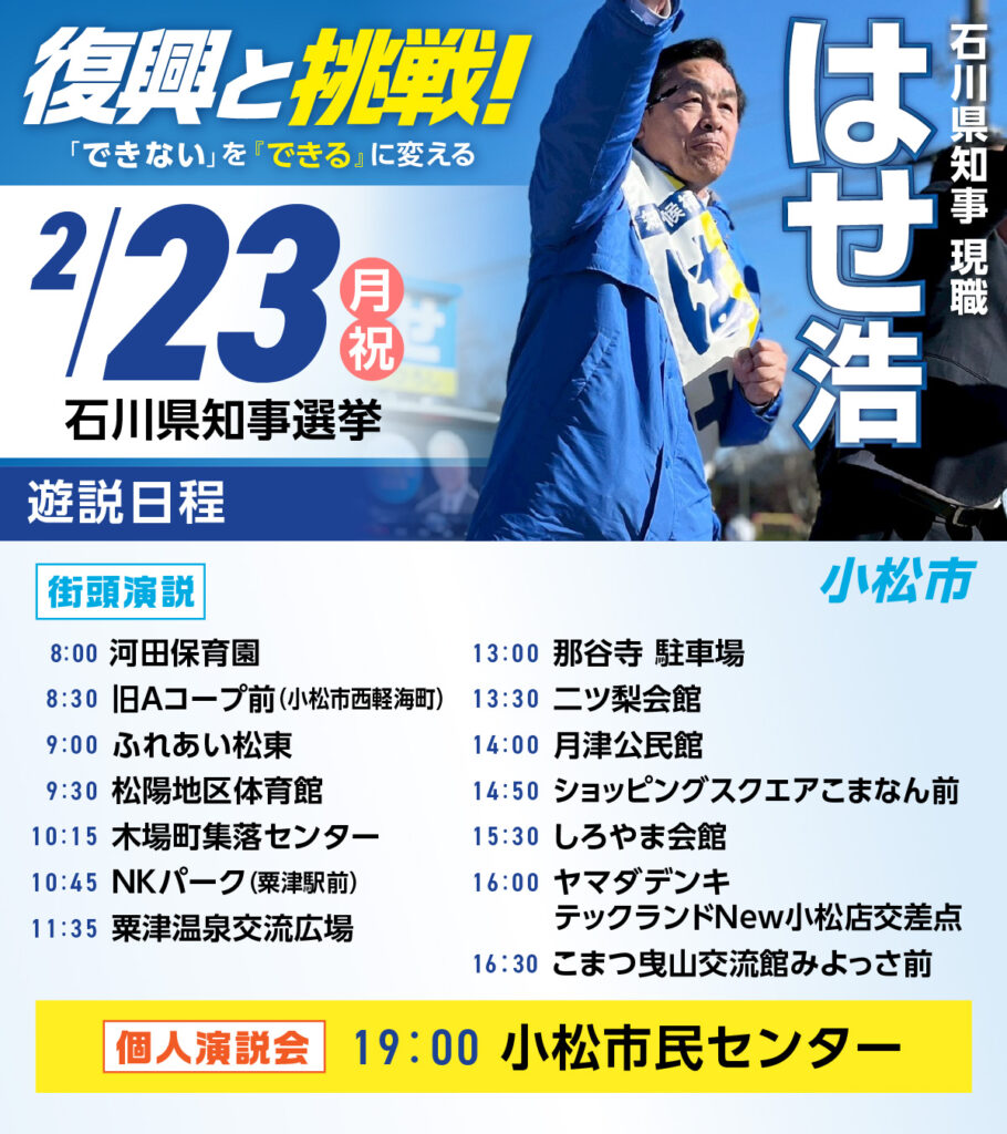 2月23日は朝から小松市へ!夜には小松市民センターで「石川県知事候補 はせ浩 総決起大会」を開催します。