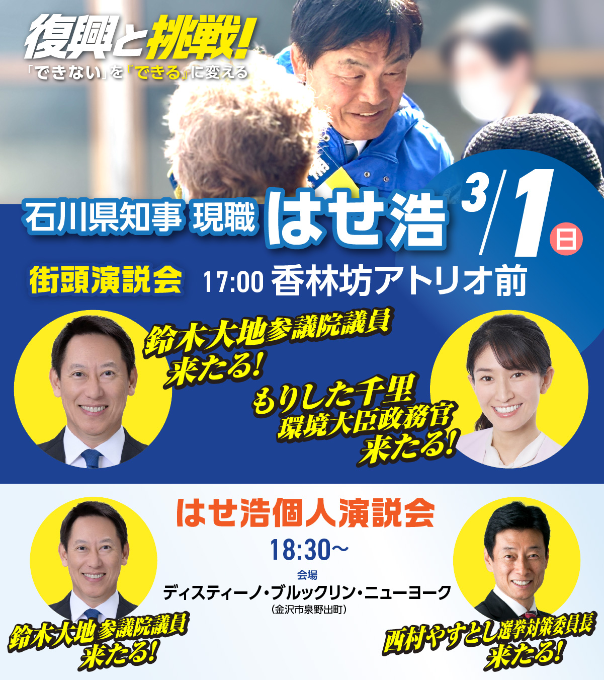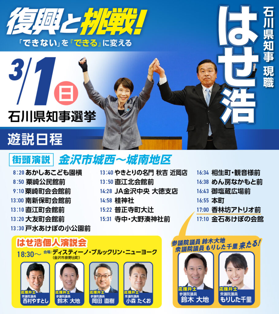 【3/1遊説予定】頼れる仲間とともに金沢市内で遊説! はせ浩 石川県知事選挙
