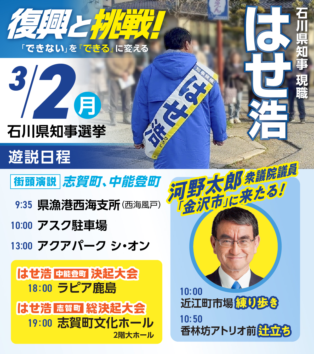 【3/2遊説予定】志賀町・中能登町で遊説!金沢市には河野太郎衆議院議員来たる! はせ浩 石川県知事選挙