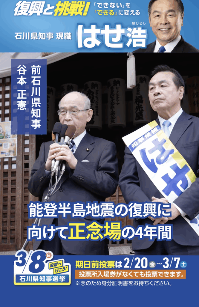NEWS お知らせ・活動報告 すべてお知らせ活動報告 2026年03月03日活動報告 金沢市長は村山たかし、石川県知事は『はせ浩』に一票を! 石川県知事選挙 2026年03月03日活動報告 はせ浩「谷本前知事からも評価、前例がなければ作る『復興と挑戦』へ!」石川県知事選挙 2026年03月03日活動報告 はせ浩「Zepp金沢の誘致、金沢城の二の丸御殿の復元など石川の文化を次世代に!」石川県知事選挙 2026年03月02日お知らせ 【3/3遊説予定】野々市市・白山市で遊説!夜は総決起大会を開催 はせ浩 石川県知事選挙 2026年03月02日活動報告 はせ浩「『今行ける能登』を強力に打ち出し、志賀町の活気を取り戻す!」石川県知事選挙 2026年03月01日お知らせ 【3/2遊説予定】志賀町・中能登町で遊説!金沢市には河野太郎衆議院議員来たる! はせ浩 石川県知事選挙 2026年03月01日活動報告 はせ浩「北陸新幹線の延伸、都ホテル跡地の再整備を進める!」石川県知事選挙 2026年03月01日活動報告 高市早苗総理演説全文「はせ浩を失っちゃいかんのです。」石川県知事選挙 2026年03月01日お知らせ 【3/1遊説予定】頼れる仲間とともに金沢市内で遊説! はせ浩 石川県知事選挙 «234»
