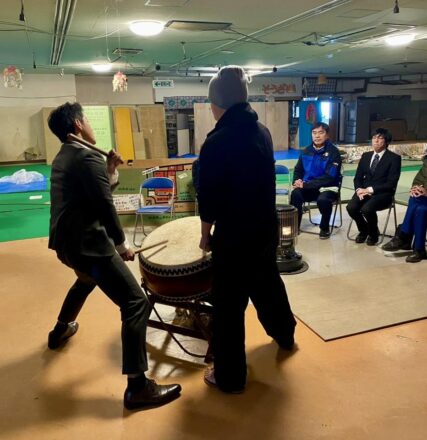 買い物の後は「もとやベース」にて、なりわい再建の申請方式や、審査の簡略化について意見交換を行いました。そしてミーティング後、被災から生き残った【奇跡のもとや太鼓】を叩いてくださり、その音色に胸が熱くなりました。