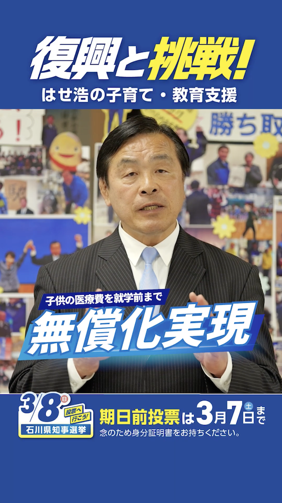 はせ浩「第一子世帯にもプレパス交付、就学前の子どもの医療費無償化も実現!」石川県知事選挙