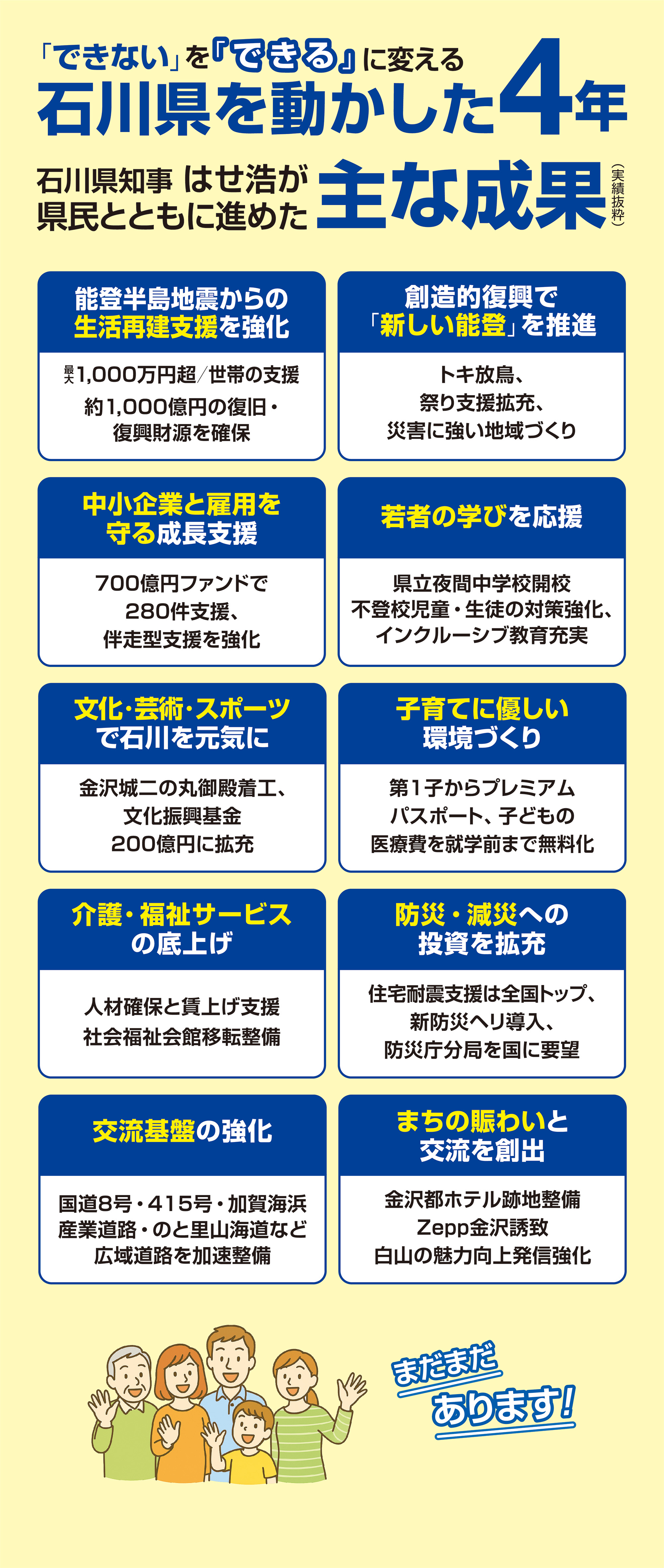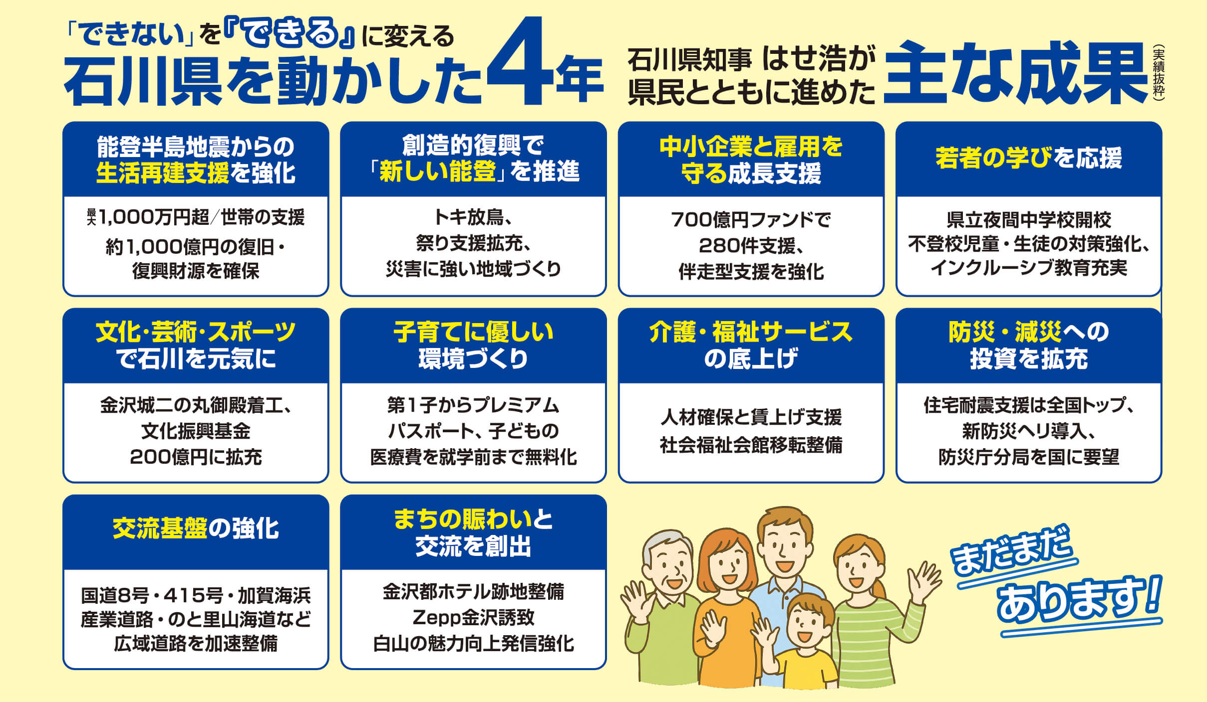 この4年間、能登半島地震や奥能登豪雨で被害を受けたインフラの復旧や、失われた家や仕事を取り戻すために、被災者お一人お一人に寄り添い、国とのパイプを最大限に生かして復旧を進めてきました。また、「石川の成長戦略」を策定し、県全体の成長にも力を注いできました。